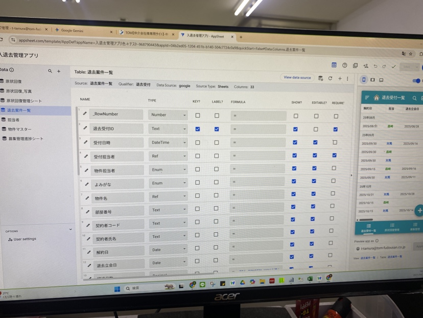実際に入退去アプリというのを作成し、退去受付~退去立会~原状回復~募集~申込~入居前チェックという一連の業務について、一目で各案件の進捗を把握できるアプリを作成しました。当然社員全員で共有できるのでミスの軽減に繋がります。